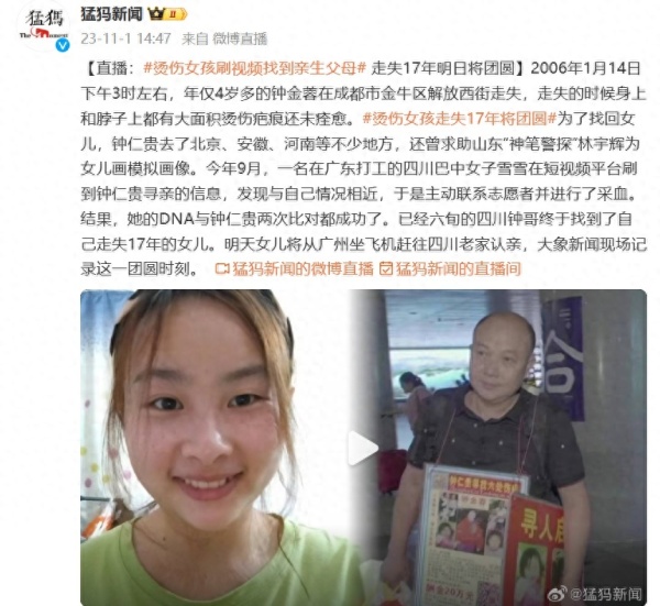 结果,她的DNA与钟仁贵两次比对都成功了。已经六旬的四川钟哥终于找到了自己走失17年的女儿。明天女儿将从广州坐飞机赶往四川老家认亲,大象新闻现场记录这一团圆时刻。