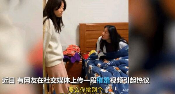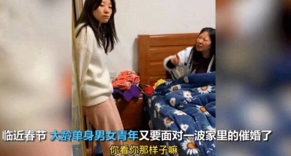 最近网上的一段“妈式催婚”视频正好对应了这种现象。视频中一位母亲对站在自己旁边的女儿大画手脚,边指责女儿“过年回家不找对象”,边朝女儿发火,而女儿也很无语地回应道:“难道歪瓜裂枣,我也要嫁给他吗?”,意思是自己在婚姻这件事上并不想马虎。而父亲站在一旁不知道如何是好,只好小声地劝解地。