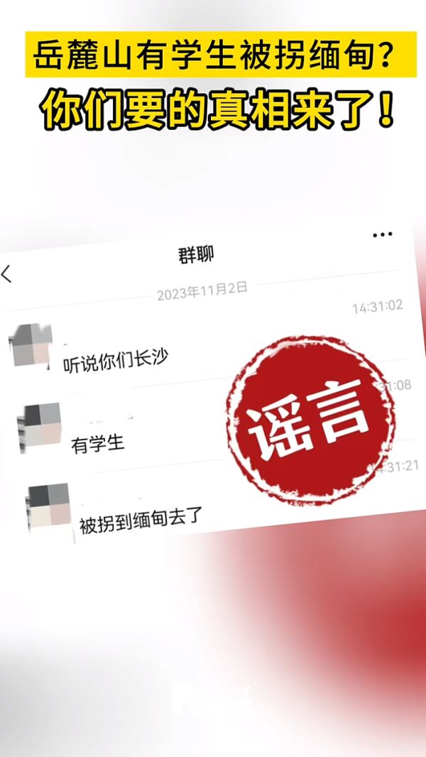 据长沙县公安局微信公众号“星沙微警”:2023年11月2日,本地微信群流传一则信息,称“岳麓山有人贩子将人直接拐卖到缅甸,大家不要去岳麓山玩‘猫抓老鼠’游戏”。
