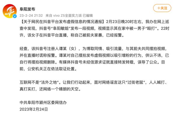 2月24日晚,安徽省阜阳市颍州区委网信办通报网民在抖音平台发布虚假信息的情况。