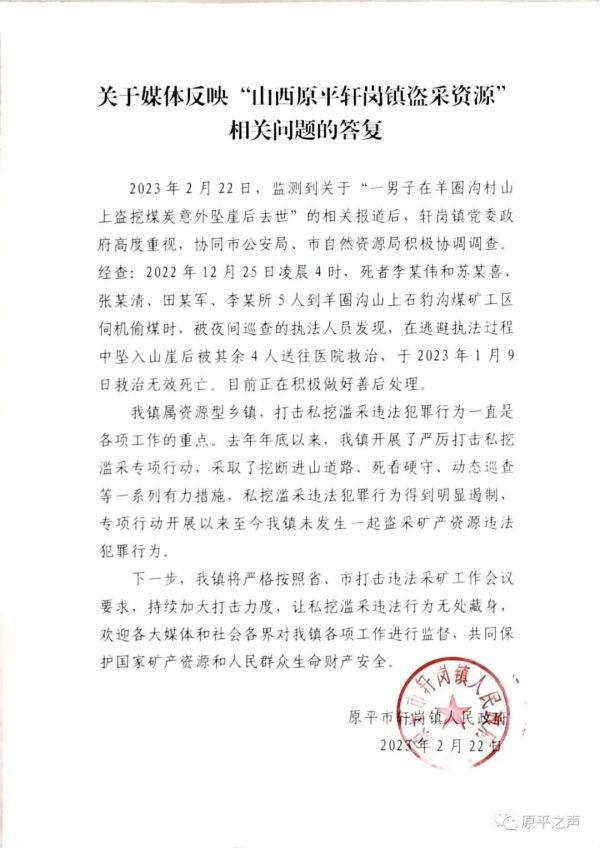 据山西忻州原平市宣传事务中心微信号“原平之声”消息,原平市轩岗镇政府发布《关于媒体反映“山西原平轩岗镇盗采资源”相关问题的答复》称,2月22日,监测到关于“一男子在羊圈沟村山上盗挖煤炭意外坠崖后去世”的相关报道后,轩岗镇党委政府高度重视,协同市公安局、市自然资源局积极协调调查。