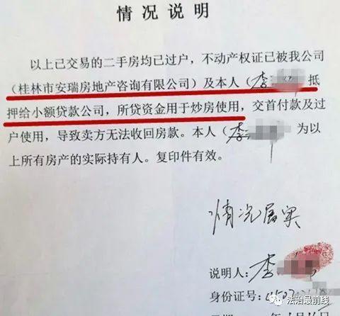 当天,桂林市安瑞房地产咨询有限公司李某帮写下了情况说明,称以上已交易的二手房均已过户,房产被公司及他本人抵押给小额贷款公司,所贷资金用于炒房,交首付款及过户使用,导致卖方无法收回房款,至于尾款什么时候给卖房者没有一个明确答复。