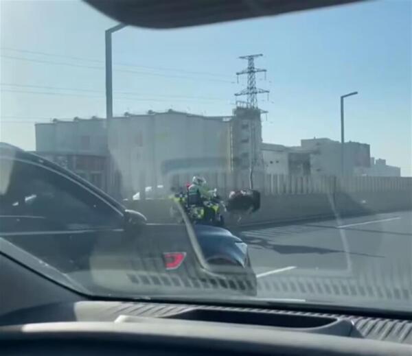 多段视频显示,有一只鸵鸟在高架上奔跑,周围的车辆纷纷避让并造成轻微堵车,交警骑车紧随其后。