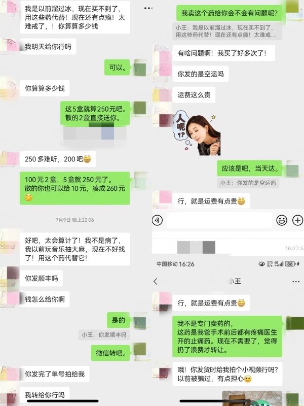 相关聊天记录显示,2023年7月8日,一名昵称“王”的群友添加了廖华的微信,廖华给对方发了父母留下药品的照片,并询问对方要哪款药品,对方直接问“泰勒宁和曲马多少钱”。经过一番讨价还价,双方约定,廖华出售5盒盐酸曲马多缓释片和氨酚羟考酮片,并赠送2盒已经开封使用过的这两款药品,共收取对方260元。购药一方让廖华邮寄药品,留下的收货地址在山东阳信县,收货人姓李。