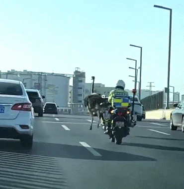 据目击者介绍,当时鸵鸟在高架桥上奔跑,因为体型庞大,加上奔跑速度很快,交警不敢冒然上前,摩托车一直在后面跟随。