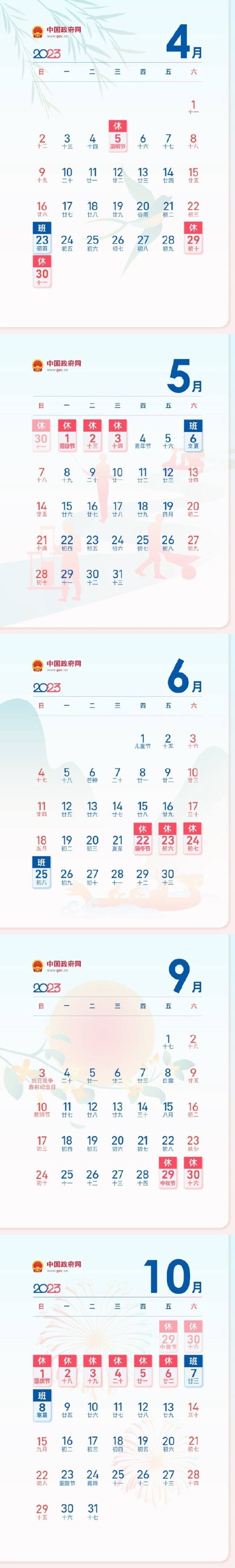 导读:今年清明节4月5日放假不调休,共1天;劳动节4月29日至5月3日放假调休,共5天;端午节6月22日至24日放假调休,共3天。