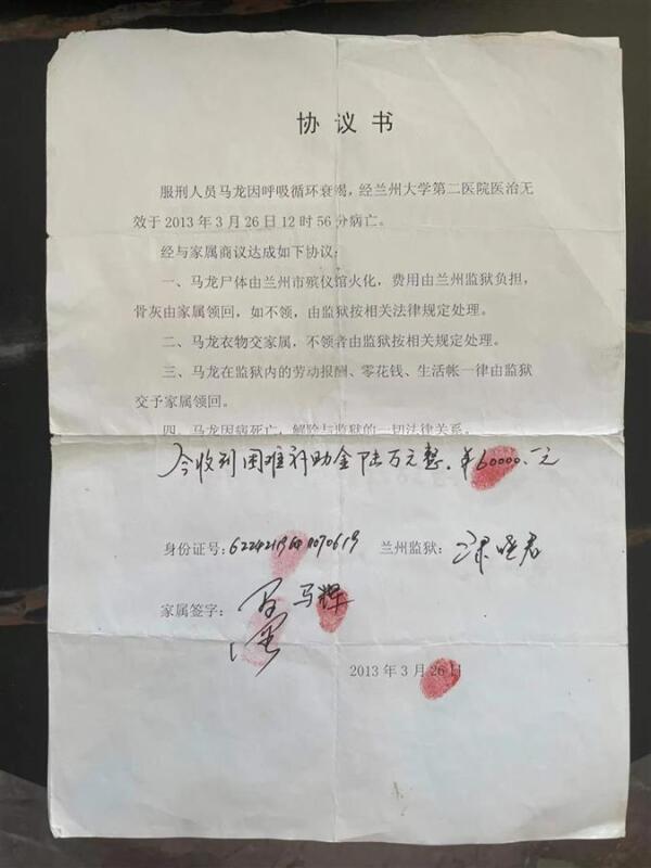 2013年3月26日晚,马龙的家人和监狱签订了一份协议书。协议写道,“马龙因呼吸循环衰竭,经兰州大学第二医院医治无效,于3月26日12时56分病亡。马龙尸体由兰州市殡仪馆火化,费用由监狱负担……马龙因病死亡,解除与监狱的一切法律关系。”协议书还显示,监狱方面给予了家属6万元“困难补助金”。