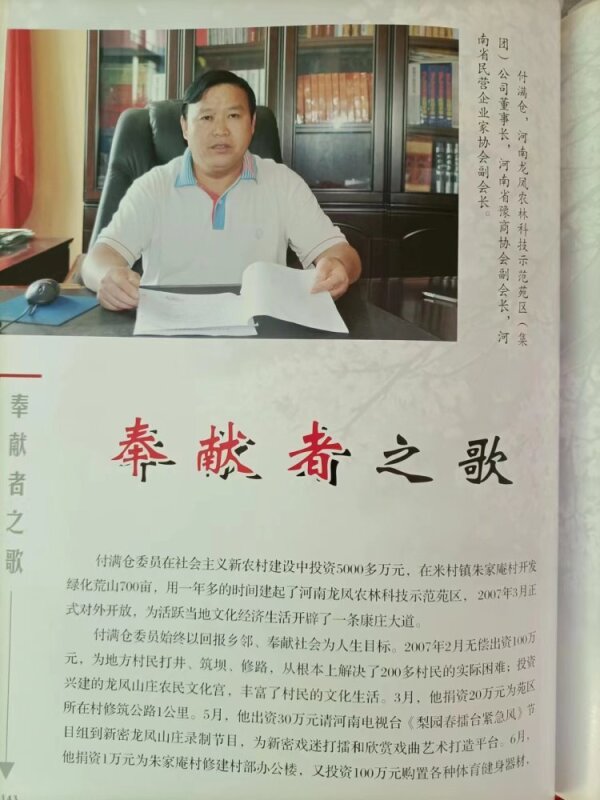 政协新密市委员会出版的《委员风采录》上写着:龙凤山庄投资5000多万元,2007年3月开放。付满仓出资为山庄所在村修建文化宫,修路,购买体育器材,带领村民共同致富……
