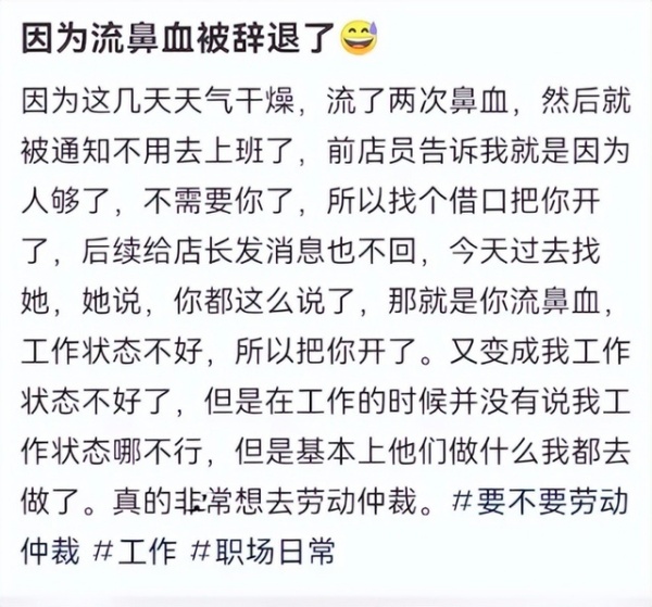 “四天流了两次鼻血,用人单位这是怕倒在工作岗位上,要担责任吧。又在试用期这个难评”