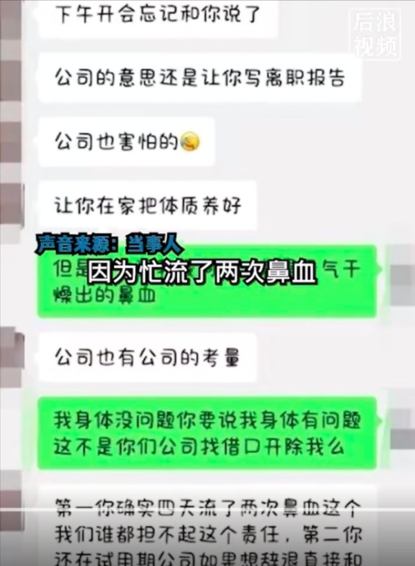 据张女士讲,当天自己流鼻血后,领导表示担忧自己的身体就让她回去休假,但在家休息一天后却收到公司信息,以流鼻血身体健康为由让她来公司递交辞职报告。