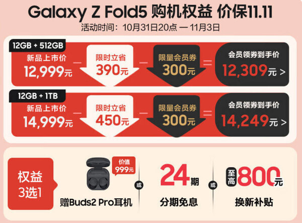 目前,三星官方针对三星Z Fold5提供了不少优惠。例如在京东自营平台,消费者购买三星Z Fold5可以享受24期免息、赠送Buds2 Pro真无线耳机和800元换新补贴三大权益任选其一,同时还可享受一年的随心换屏和超过600元的优惠。