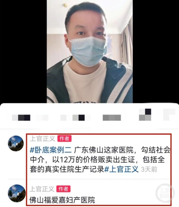 11月10日,打拐志愿者上官正义在其社交平台账号下指名道姓称“佛山福爱嘉妇产医院”。这条原发短视频发布时间为11月7日,文字内容为:#卧底案例二 广东佛山这家医院,勾结社会中介,以12万的价格贩卖出生证,包括全套的真实住院生产记录#。