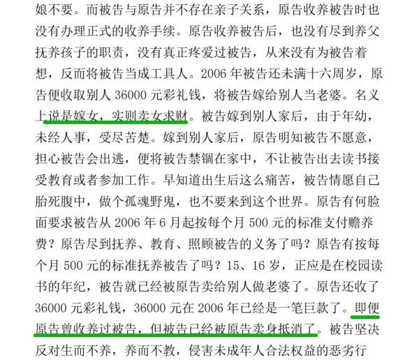 “在原告以36000元价格将被告嫁给别人做老婆的时候,将被告遗弃牟利的时候,被告与原告的事实收养关系已经宣告解除。”黄某2在申辩时说道。