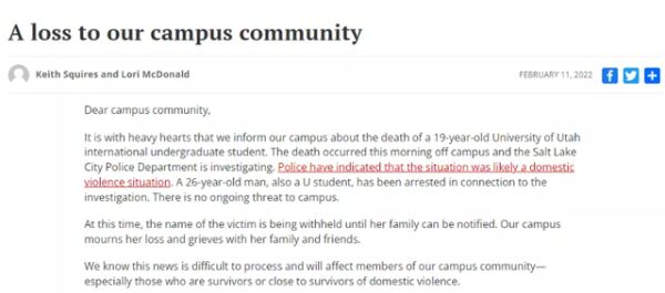 随着案件调查的展开,董同学所在的犹他大学在此事件中的不作为受到广泛质疑。根据犹他大学本周二(19日)公布的一系列文件显示,受害者董同学因学校的一系列失误而死于前男友之手。