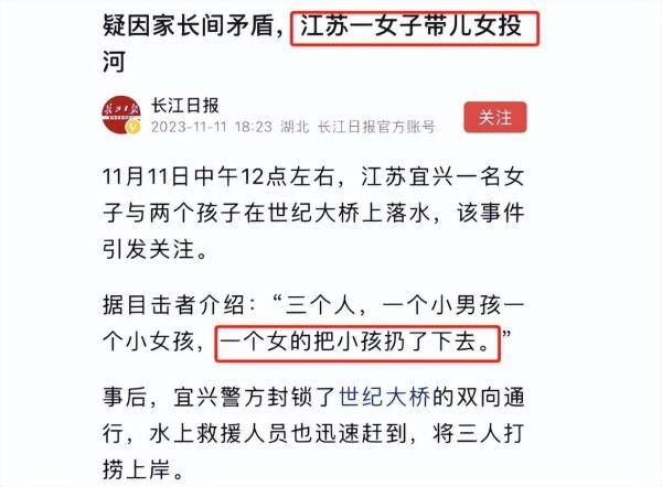 这件事不知道大家都听说了没?11月11日中午12点,江苏宜兴一位母亲带着儿子和女儿投河,目前儿子经医院确认已经死亡,母亲和女儿正在抢救。