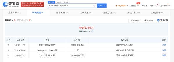 【大河财立方消息】天眼查App显示,近日,大连万达集团股份有限公司及旗下仁寿万达广场置业有限公司新增一则被执行人信息,执行标的1.63亿余元,执行法院为成都市中级人民法院。