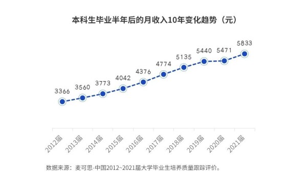 根据麦可思曾对大学毕业生的收入分布分析显示,2021届本科毕业生的平均薪资为5833元,为近10年中最高水平。