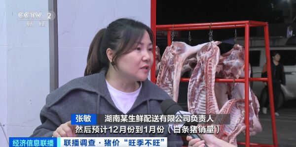 湖南某生鲜配送有限公司负责人 张敏:10月份到11月份(每天销量)是450头到600头。预计12月份到1月份(白条猪销量)会增长到一天800头到1000头。据农业农村部对500个集贸市场的监测,截至11月第2周,生猪价格15.18元/公斤,比上个月同期的价格下降了0.73元/公斤,降幅为4.5%,同比下跌42.1%。