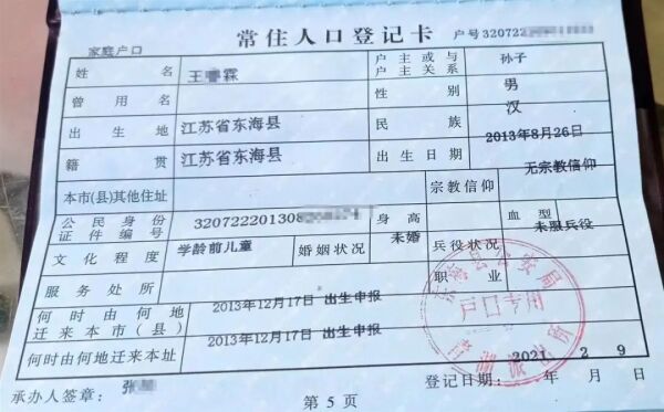 据上游新闻报道,王先生家住东海县青湖镇磨山村,今年已经70多岁了。他在为儿子迁移户口时意外发现,户口簿上儿子名下多出一个10岁的孩子。事实他儿子今年38岁,一直没结过婚,连女朋友都没有,对于这个“孩子”他们一家人都不知情。