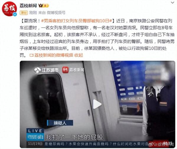 近日,南京铁路公安民警在列车巡逻时,一名女列车员向他报警称,有一名老汉对她耍流氓。民警立即在8号车厢找到这名旅客。起初,该旅客并不承认,经过不断盘问,才终于坦白自己下车抽烟后,上车时经过迎宾的列车员身边,用手拍打了列车员的臀部。随后,民警将男子徐某移交给铁路派出所。目前,徐某因猥亵他人,被处以行政拘留10日的处罚。