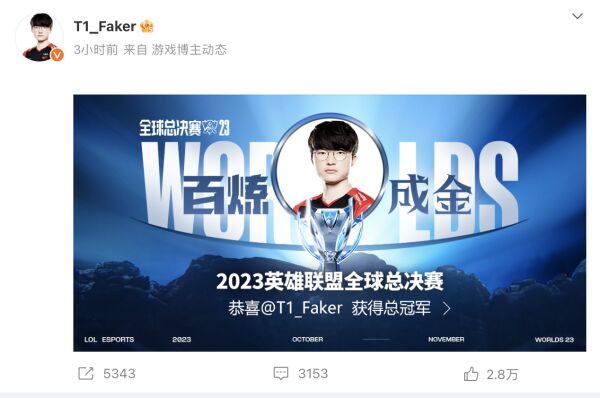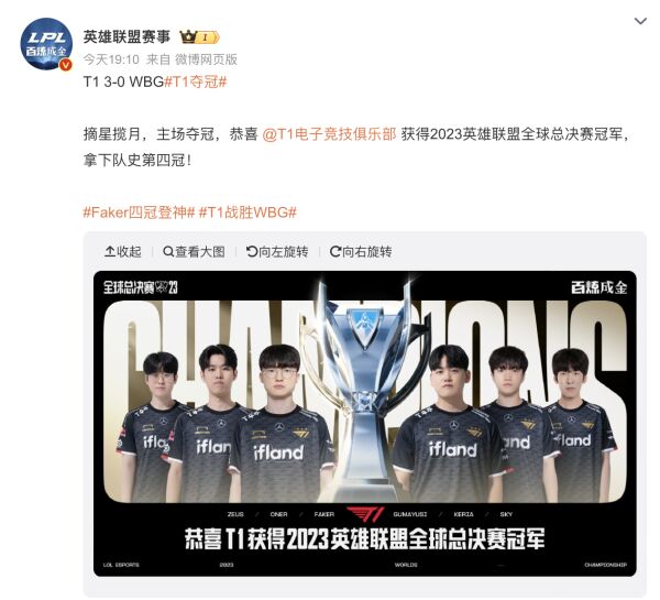 11月19日下午,2023英雄联盟全球总决赛(以下称“世界赛”)在韩国首尔落下帷幕,李相赫率领的T1战队击败WBG,历史第四次夺得世界赛冠军。