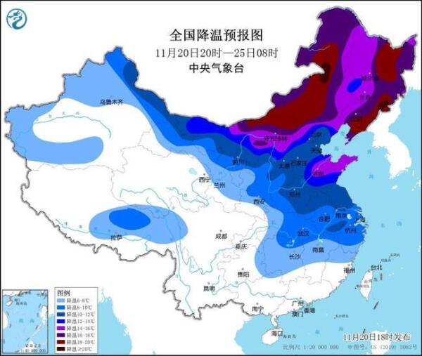 受寒潮影响,11月20日夜间至24日,我国长江中下游及以北地区气温将先后下降6~10℃,其中,内蒙古、东北地区、华北西部和北部、黄淮东部等地降温12~16℃,内蒙古中东部、东北地区东部等地部分地区降温幅度可超过16℃,大风降温主要时段为22日至24日;寒潮影响后,最低气温0℃线将位于苏皖中北部至河南中南部、陕西南部、甘肃东南部等地,内蒙古中东部和黑龙江大部最低气温将降至-20℃以下,局地可达-30℃以下;同时,上述大部地区伴有4~6级偏北风,阵风7~8级,局地9级;23日至25日,我国东部和南部海区也将先后出现6~8级大风,阵风9~10级。