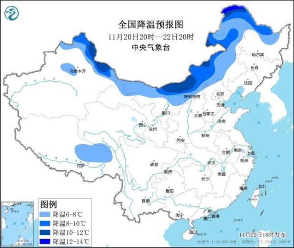 预计,20日20时至22日20时,新疆北部、内蒙古大部、黑龙江北部等地气温将下降6~10℃,局地降温10℃以上。