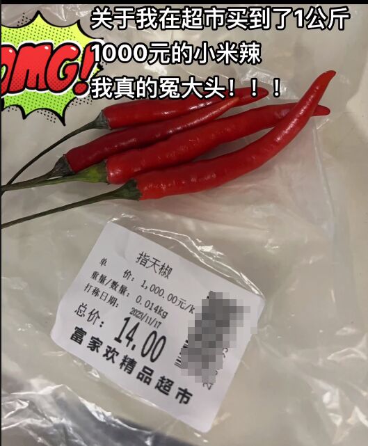该女子发布的图片显示,商品价签显示为指天椒,单价每千克1000元,购买了0.014千克,总价14元,打秤日期是2023年11月17日,超市名为富家欢精品超市。