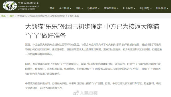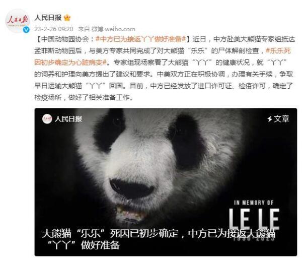 2023年2月2日,中国动物园协会接到美国孟菲斯动物园通知,旅美开展大熊猫保护合作研究项目的25岁大熊猫“乐乐”于美国当地时间2月1日早晨被发现死亡。中方对此深表遗憾和惋惜。