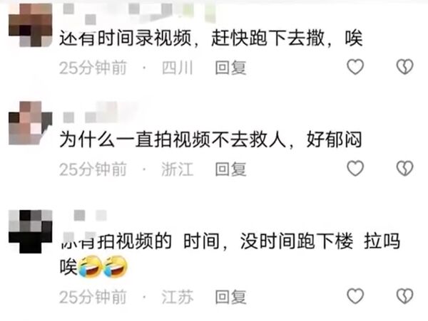 视频发布后,引发网友热议。不少网友质疑视频拍摄者,“为什么一直拍视频不去救人?”“你有拍视频的时间,没时间跑下楼吗?”