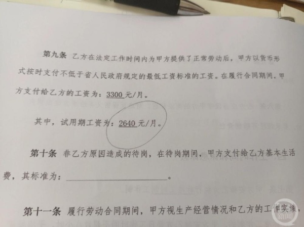 一段小古老师与长水实验中学人力邓女士的对话截图显示,小古老师没有在入职的第一时间拿到所签的劳动合同,人力邓女士的回复对此没有否认,还让其抽空来领取。小古回应称:“你们虚假招聘,请你务必把某直聘平台上的待遇改为最真实的,否则我维权到底。”另一张劳动合同照片显示,“第九条:在履行合同期间甲方支付给乙方的工资为3300元/月。其中,试用期工资为2640元/月。”