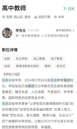 ▲招聘信息显示,长水实验中学高中教师薪酬区间在7000-12000元。