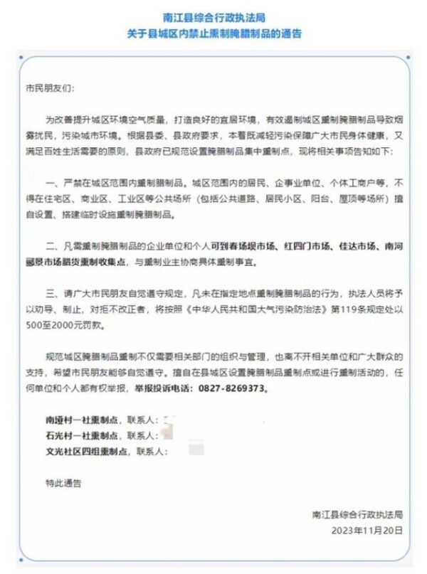 11月15日,通江县综合行政执法局联合巴中市环保局、相关街道办、新区管委会,发布了《关于在通江县城区集中熏制腊制品的通告》。通告表示,“随着熏制腊制品高峰期到来,熏制产生的烟尘将污染空气,影响市民生产、生活,并存在火灾安全隐患。为尊重传统、方便市民,同时保护生态环境、保障熏制安全,根据有关规定,禁止在县城区农贸市场、居民小区院内、楼道、阳台、屋顶以及岩坡旁、路边、河沟等非指定地点熏制腊制品;禁止在县城区内擅自搭建腊制品熏制设施;县城区腊制品实行定点集中熏制。”