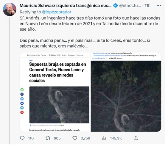 洛佩斯相关推文下方,有网友直接回复、转发称,“是的,安德烈斯(洛佩斯),3天前一位工程师拍了这张照片。但这张照片从2021年2月的新莱昂州开始,到同年12月份的泰国,都有出现过。你好丢人,太丢人了……我们国家最丢人……如果你真信了,那你就是个傻瓜……如果你知道这是假的,那你真是用心险恶……”