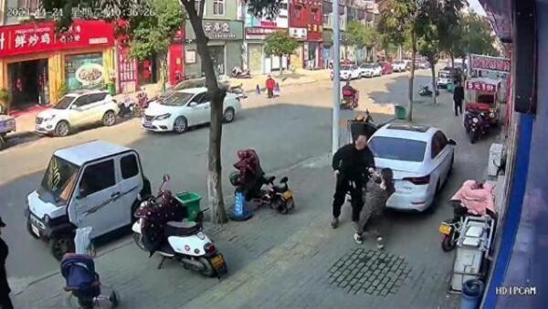 据现场监控视频,一辆白色轿车停在人行道上,一名男子与一名女子正在交涉。该男子一边问“你能不能放我气”,一边上前将女子推倒。女子随后表示自己已经怀孕,要拨打120,推人男子回应“你打呗”。视频发布者称,被推倒的女店主已经怀孕6个月。