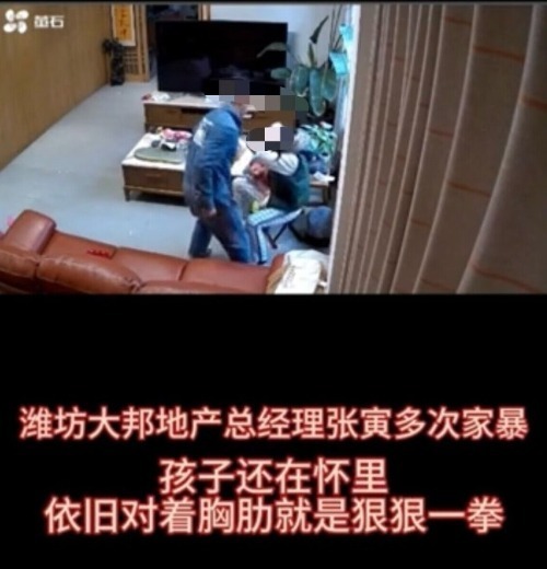 视频发布者称,该视频是屋内监控,施暴男子是潍坊大邦房地产公司青州分公司负责人张某,是被打女子的丈夫。该男子施暴时根本不管不顾孩子的哭喊,女子怀孕时也被殴打过,辱骂更是家常便饭。挨打女子还手或者还嘴,招来的将是更狠的毒打。