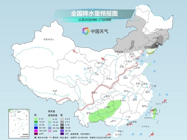 明天,内蒙古中东部、东北地区中南部、河北北部等地部分地区有小雪或雨夹雪,其中,内蒙古东南部、吉林东部、辽宁中东部等地部分地区有中到大雪。湖南西部、贵州南部、云南中东部、广西西部、台湾岛大部等地部分地区有小雨。