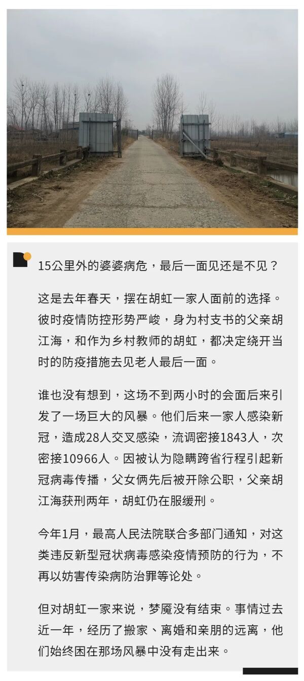 导读:身为村支书的父亲胡江海和作为乡村教师的胡虹疫情时跨省探亲获刑。事情过去近一年,胡虹一家经历了搬家、离婚和亲朋的远离。