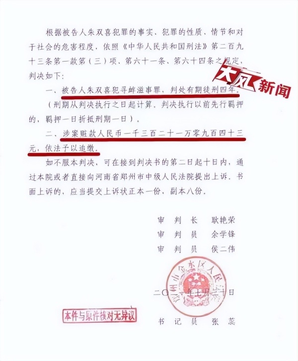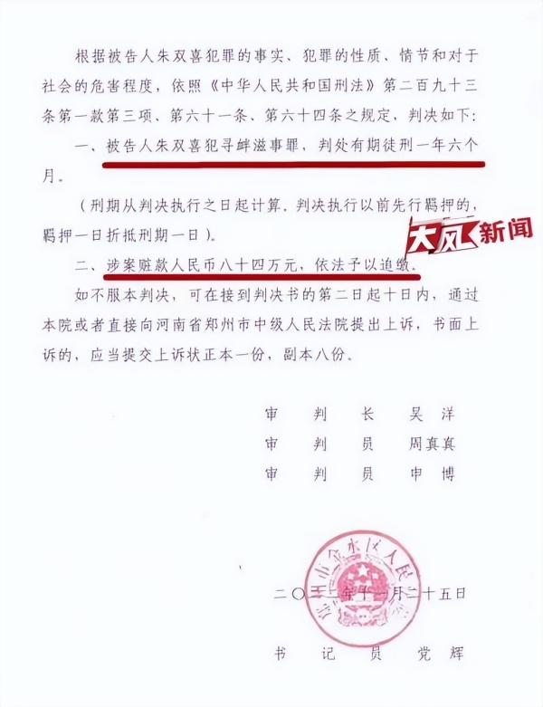 2022年11月25日,金水区法院宣判称,根据朱双喜犯罪的事实、犯罪的性质、情节和对于社会的危害程度,朱双喜犯寻衅滋事罪,判处有期徒刑一年六个月,涉案赃款84万元依法予以追缴。