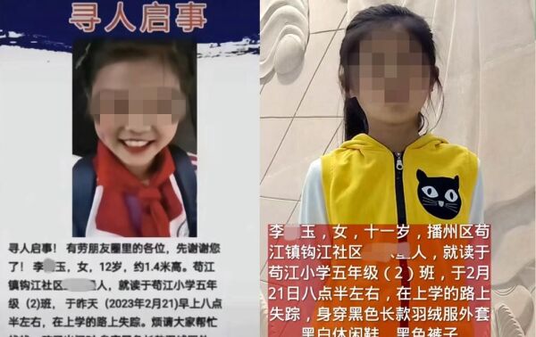 近日,有关“贵州遵义12岁女孩失联”的报道引发了广泛的关注,据网传的寻人启事显示:失踪的女孩名为李某玉,苟江镇钩江社区人,今年12岁,就读于苟江小学五年级(2)班,2023年2月21日早晨在上学的路上失踪,家人寻找无果之后报警,经过几日的寻找,依然杳无音信。