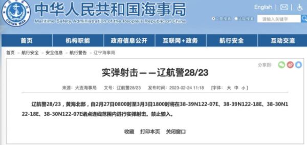 导读:据中国海事局网站消息,大连海事局发布航行警告,自2月27日8时至3月3日18时,黄海北部部分海域进行实弹射击,禁止驶入。