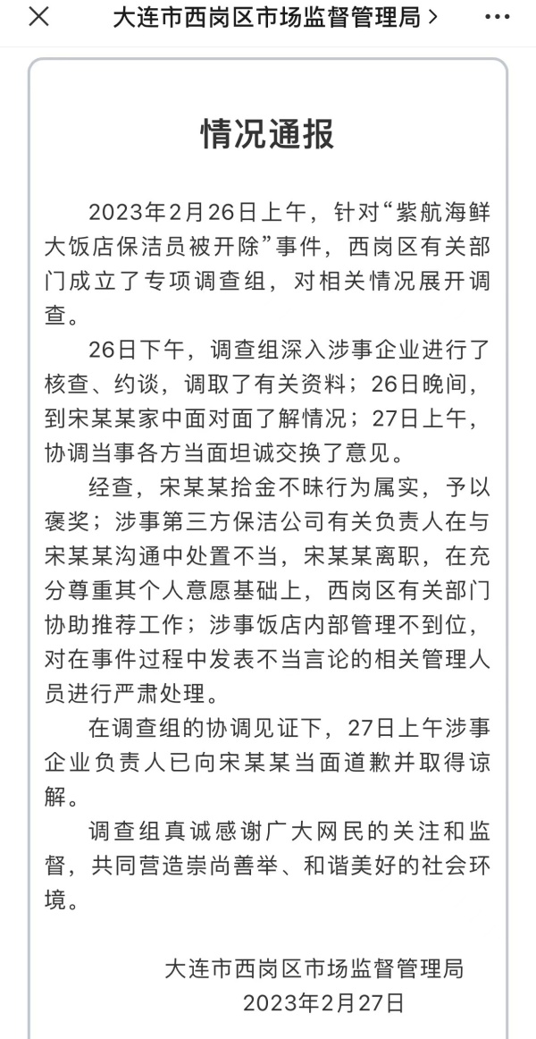2月27日,大连市西岗区市场监督管理局发布通报称:宋某某拾金不昧行为属实,予以褒奖;涉事第三方保洁公司有关负责人在与宋某某沟通中处置不当,宋某某离职,在充分尊重其个人意愿基础上,西岗区有关部门协助推荐工作;涉事饭店内部管理不到位,对在事件过程中发表不当言论的相关管理人员进行严肃处理。