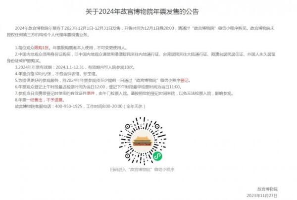 事情详述 故宫博物院今天发布消息,2024年故宫博物院年票将于2023年12月1日至12月31日发售,开售时间为12月1日晚20:00,请通过“故宫博物院”微信小程序购买。故宫博物院未授权任何第三方机构或个人代理年票销售业务。2024年年票有效期:2024.1.1-12.31,有效期内可入院参观10次。 年票价格300元/张,不包含钟表馆、珍宝馆。文/于建编辑/乔颖 255, 108, 233, 69, 248, 45, 60, 144