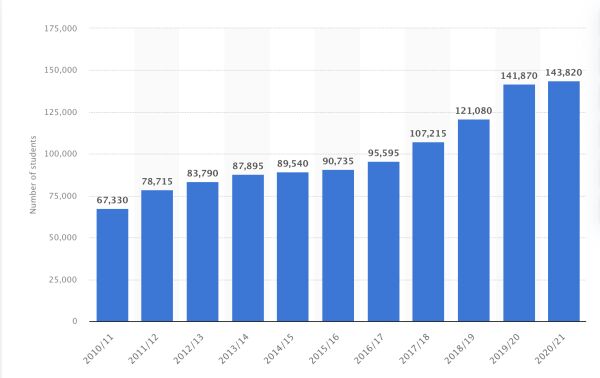 2010/11-2020/21学年在英中国学生数量变化。 图源:Statistics