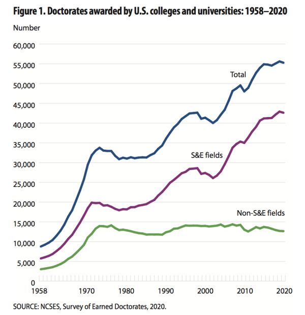 1958-2020期间在美国获得博士学位的人数。 图源:NCSES