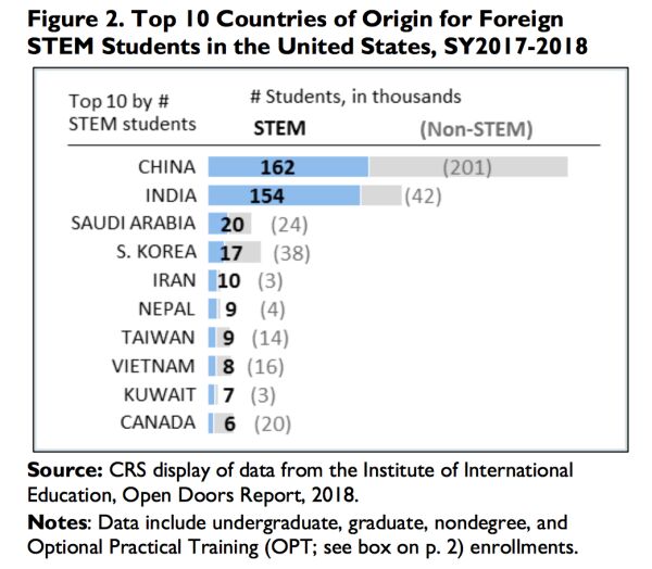 2017/18学年在美学习STEM专业的留学生十大来源国。 图源:CRS