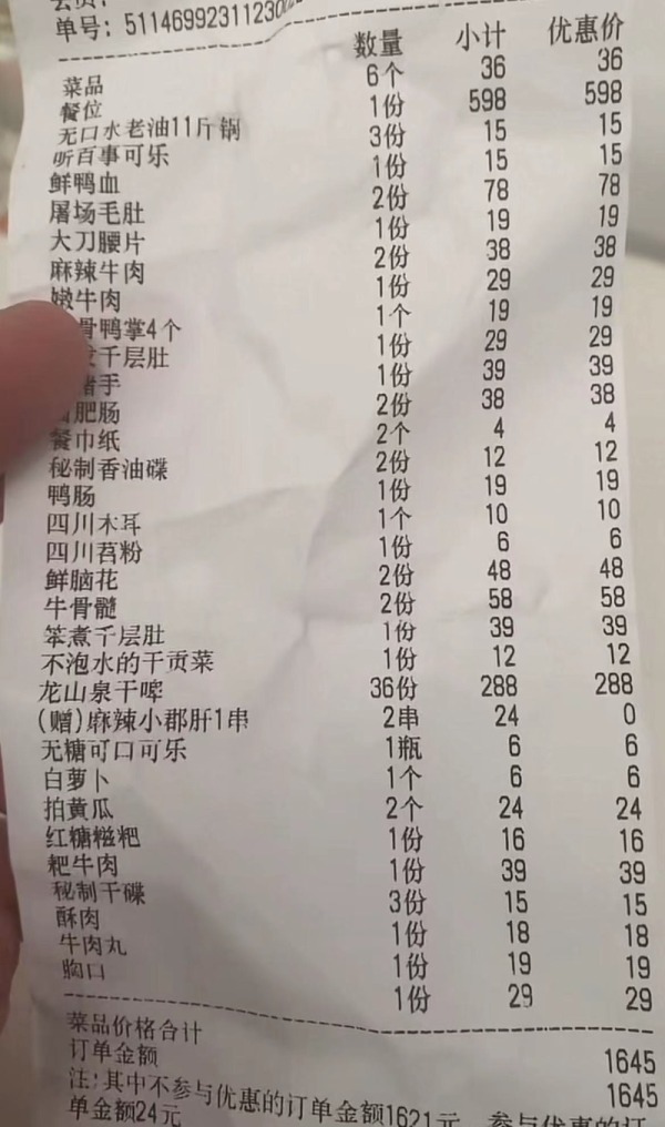 根据该网友晒出的小票,他们在餐厅点的是“无口水老油11斤锅”,标价为598,男子在视频下吐槽:“总感觉哪里不对。”据悉,这是一家全国连锁火锅店,店内除了598的老油锅底外,也有最低价89的红汤锅底等几个档位可以选择。评论区有吃过的网友表示这家店口味好、可以自带食材,这个价格可以理解;也有不少网友还是觉得价格离谱,并且疑惑,“难道没标注的就是有口水的了吗?”