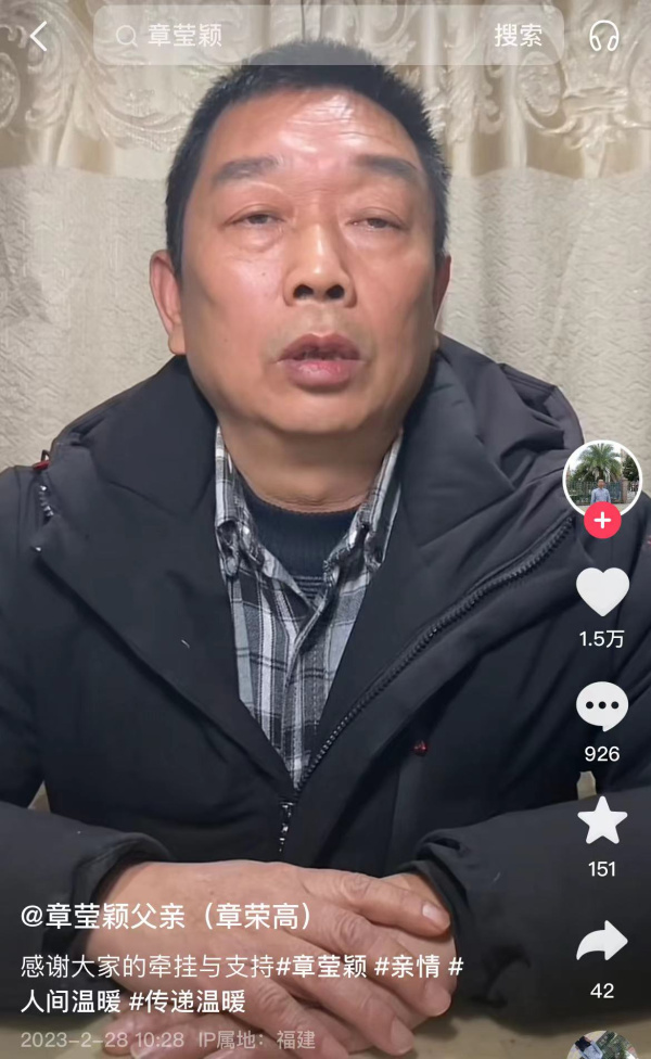 “我回到之前的工作岗位,儿子也开始去打工,但是我爱人的身体已经垮了,她的肠胃很差,一吃东西就容易不舒服,牙齿也松动了,只能在家里休息。”视频中,章荣高描述了家中目前的生活状态,而对于女儿章莹颖依旧难掩思念,“只要有机会,我们就会想去美国看她,虽然机票对我们是很大的支出,但我们还是尽力希望家人能聚在一起,我们努力生活下去。”