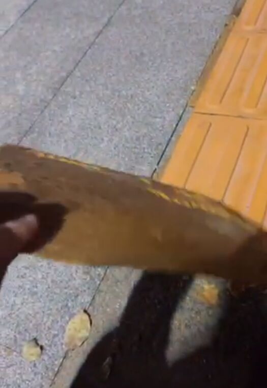 该网友发布的视频显示,道路的地砖上贴有两条黄色的盲道,她蹲下后,随手拿起其中一片,背面的胶水已经干了,地砖上还留有被粘黏过的印记。“仅有一层皮,像贴纸一样,一撕就掉。”