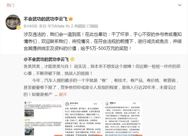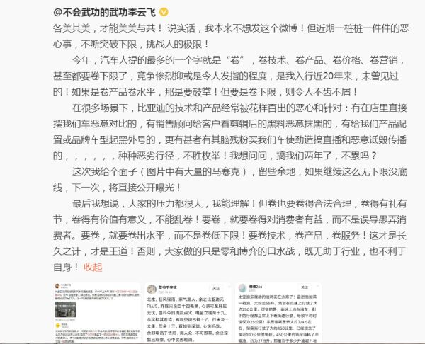 比亚迪公关总经理@不会武功的武功李云飞发文称,“今年,汽车人提的最多的一个字就是“卷”,卷技术、卷产品、卷价格、卷营销,甚至都要卷下限了,竞争惨烈抑或是令人发指的程度,是我入行近20年来,未曾见过的!如果是卷产品卷水平,那是要鼓掌!但要是卷下限,则令人不齿不屑!”